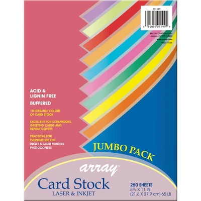 Array Card Stock is perfect for greeting cards, postcards, report covers, rubber stamping, memory books, flyers, announcements and more. This acid-free card stock comes in 250 sheet pack. Basis paper weight is 65 lbs. Colors included are Rojo Red, Pumpkin, Emerald Green, Hyper Yellow, Marine Blue, Violet, Hyper Lime, Hyper Pink, Cobalt Blue and Gold.