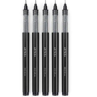 Arteza Liquid Micron Pen Black Pigment Ink – 5 Piece (ARTZ-4343): Our professional-grade liquid micron pens are perfect for creating illustrations, comic art, writing, outlining your drawings, and even signing your finished works or prints. Our premium liquid micron pens are water-resistant and fade-resistant. The water-based, Japanese, black ink that fills each pen included in this set of five does not bleed through most papers. This set includes one of each of the following sized tip sizes: 0.2 mm, 0.25 mm, 0.35 mm, 0.45 mm, and 0.6 mm; providing artists with true range.