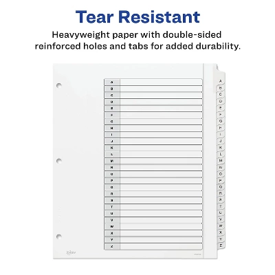 Organize documents quickly and easily with extra-wide dividers that are ideal for documents in 9″ x 11″ sheet protectors. A reinforced table of contents page and coordinating preprinted tabs make referencing easy while offering a professional look. Customize the table of contents page with section titles as well as graphics or a company logo. Heavyweight paper with extended tab reinforcement and double-sided hole reinforcement prevents tearing even with frequent use. Extra-wide A-Z Ready Index Dividers can be used in portrait or landscape formats. Easily customize with free online templates and designs using Avery Design and Print. They are compatible with laser and inkjet printers. Extra wide for use with documents in 9″” x 11″” sheet protectors. Grayscale shading on the Table of Contents for a distinctive look. Heavyweight paper with double-sided hole reinforcement to prevent tearing. Tab reinforcement. Easy to customize with free online templates and laser or inkjet printer. Sold as 1 ST.