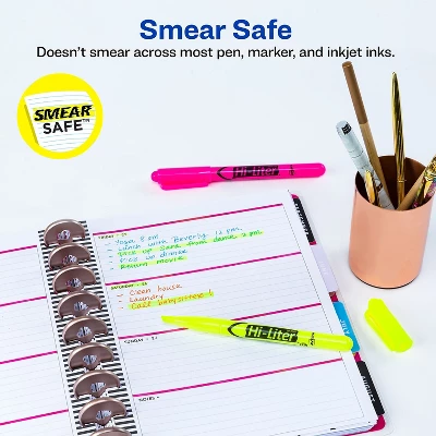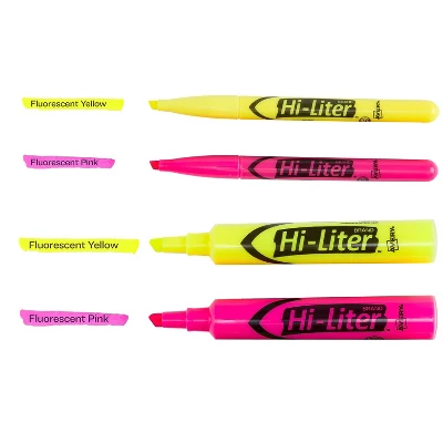 HI-LITER Desk Style Highlighter with brilliant read-through fluorescent yellow and pink colors and a durable plastic chisel tip won’t fray or mush. HI-LITER Assorted desk style highlighter features chisel tip that does not fray or mush. Highlighter has durable plastic tip for smooth highlighting. The original highlighter with brilliant read-through colors and a molded chisel tip to highlight or underline. Durable plastic tip for smooth highlighting—won’t fray or “mush. Formula allows you to leave cap off for up to one week and still highlight. Quick-drying ink. Sold as 24/Box.