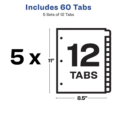Create customized tabs fast with these Avery EcoFriendly Index Maker clear label dividers. Easily create print shop quality personalized binder dividers with tabs while staying environmentally-friendly with Avery EcoFriendly Index Maker Clear Label Dividers. Made from 100% post-consumer recycled paper, these 3 ring binder dividers with tabs are a great addition to your medical office supplies, school binders, personal organizers, tax office supplies, presentation reports and more. Customize the title tabs for your dividers quickly and easily using the free templates on the Avery website and print with your inkjet or laser printer for clean, professional looking results in minutes. This pack comes with 5 sets of 12 tab dividers, and the Easy Apply clear label strips make it simple to apply all 12 labels of each set at once. Just print, align labels against tabs, smooth down labels and peel up strip. Each 3-hole punched durable divider also features doubled-sided, reinforced tabs and edges to help resist tearing for long-lasting, everyday use. Print, peel, and press your way to a perfect, precise project. Eco-friendly tabbed dividers are made from 100% recycled paper and feature doubled-sided reinforced tabs and edges for extra durability. Save time and money by creating your own high-quality custom tab dividers using free templates from the Avery website and printing on your laser or inkjet printer. Label all 12 tab dividers at once with the Index Maker Easy Apply Label strip that results in five perfectly aligned sets of tabs. Get a professional, printed-on look with clear labels that virtually disappear on the white divider tabs. Great for organizing your medical document binder, meeting materials, proposals, tax organizer binder, financial planner and more. Tab dividers let you organize projects, personal documents, and more. White in color and made of paper. Dimensions: 8.5″W x 11″L. Three-hole punched and ready for use. They..