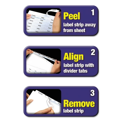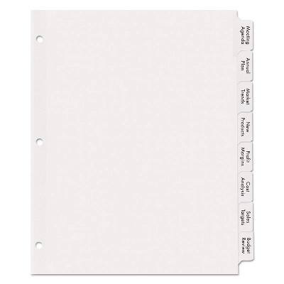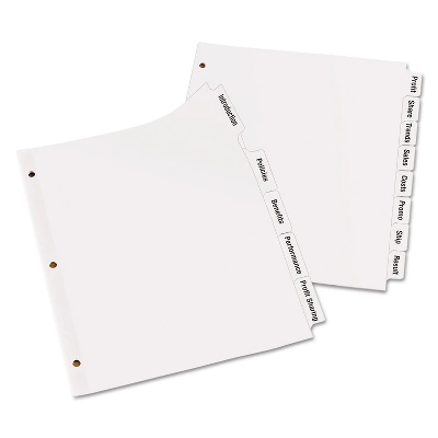 Collate and categorize binder contents with these Avery Index Maker eight-tab clear-label presentation index dividers. Don’t waste time and money ordering custom printed binder dividers with tabs when you can easily create and print your own personalized dividers with Avery Index Maker Clear Label Big Tab Dividers. Our larger Big Tab design offers more room for bigger fonts, more text and even logos or images. Customize your title tabs quickly and easily using the free templates on the Avery website and print with your inkjet or laser printer for clean, professional looking results in minutes. This pack comes with 5 sets of 8-tab dividers, and the Easy Apply clear label strips make it simple to apply all 8 labels of each set at once. Just print, align labels against tabs, smooth down labels and peel up strip. Each 3-hole punched durable divider also features doubled-sided, reinforced tabs and edges to help resist tearing for long-lasting, everyday use. These 3 ring binder dividers with tabs are a great addition to your medical office supplies, school binders, personal organizers, tax office supplies, presentation reports and more. Print, peel, and press your way to a perfect, precise project. Get 40% more writing space than other tabbed dividers with our Big Tab design, perfect for more text, bigger fonts, logos and more. Save time and money by creating your own high-quality custom tab dividers using free templates from the Avery website and printing on your laser or inkjet printer. Label all 8 tab dividers at once with the Index Maker Easy Apply Label strip that results in five perfectly aligned sets of tabs. Get a professional, printed-on look with clear labels that virtually disappear on the white divider tabs. Great for organizing your medical document binder, meeting materials, proposals, tax organizer binder, financial planner and more. Tab dividers let you organize projects, personal documents, and more. Clear color. Dimensions..