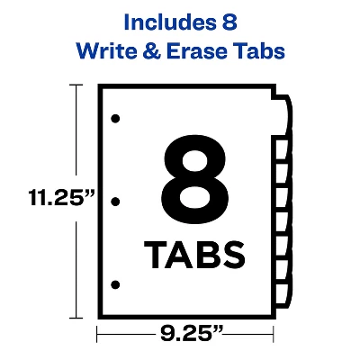 Get extra storage space and subdivide documents with this set of Avery durable eight-tab multicolor poly write-on pocket dividers. Organize papers with these durable eight-tab dividers. The tabs let you write and erase labels, so you can reuse them as often as needed, while the built-in pockets offer extra storage for loose papers. This set of Avery multicolor pocket dividers is made with durable poly to withstand daily use, while the multicolor tabs let you find the section you need quickly. Tab dividers let you organize projects, personal documents, and more. Multicolor tab dividers made of durable plastic. Dimensions: 9.25″”W x 11.13″”L. Three-hole punched and ready for use. Eight per set. Tear-resistant for long-term use. Durable plastic is tear-resistant and wipes clean with most non-abrasive household cleaners. Sold as 8/ST.