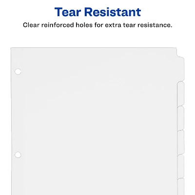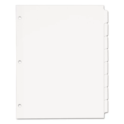Categorize papers easily with these Avery eight-tab white write & erase tab dividers. Locate documents quickly by using these write-on tab dividers. With a three-hole-punch design, these dividers can be easily added to a binder or folder, and the bright white color provides a crisp backdrop that helps ensure your titles stand out. These Avery white dividers come with eight tabs, so you can keep important subjects subdivided, and the write-on format makes labeling each one simple. Tab dividers let you organize projects, personal documents, and more. Made of white paper. Dimensions: 8.5″”W x 11″”L. Eight-tab set of three-hole punched dividers. 24 sets per box. Sold as 24/Box.