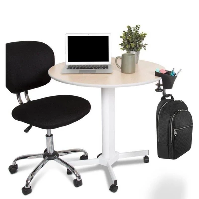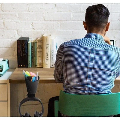 De-clutter your desktop with the Stand Steady pen cup. This multifunctional desktop organizer has two storage compartments to hold pens, pencils, paperclips, and more. A built-in storage hook makes hanging your bags, sweaters, or headphones a breeze. The clamp-on base securely attaches to your desktop, without leaving behind any marks. Plus, there’s no assembly required – just take out of the box and clamp on to your worksurface. It’s that easy. Want to know more? This storage solution has overall dimensions of 2.5” wide by 5.5” deep. The securing clamp sits 3.5” below your desktop and clamps onto worksurfaces up to 1.85” thick. This storage solution features two organization compartments, including one 2.5” long by 2.75” wide and 3.75” deep compartment and one 2.5” long by 2.25” wide compartment that’s .75” deep. The built-in hook’s weight capacity is 10 lbs.