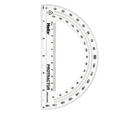 Helix 180 Degree Standard Protractor, 6″, Pack of 25 | The classic school protractor! This 180 degree protractor is made of crystal clear plastic construction so you can easily see the angle you’re drawing, and features 6″ and 10cm rulers for easy measuring. Integrated centering hole is easy to set at the angle start point, and the angle graduations allow you to measure angles right to left or left to right. Protractor edge features beveled edges for clean, accurate lines! Sold as a pack of 25 protractors.