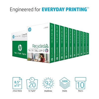 Stock up on a carton of HP Office recycled paper to keep your printers full and ready at all times. Fill your Office printers and copiers with HP office recycled paper for bright and clear printouts. Each letter-sized page has a matte finish that is ideal for use with colorful graphics and fonts. Made of 30-percent recycled postconsumer content, this 5,000-sheet carton of HP Office recycled paper is a responsible choice for large office use. Reliable multipurpose paper is perfect for everyday use. Paper weight: 20 lbs.; 50.8 lb. Text. Sheet dimensions: 8.5″ x 11″ (US letter). Brightness rating: 92. Matte finish. 500 sheets per carton. Acid Free. Color: White. FSC Certified. Contains 30% recycled post-consumer content for a sustainable choice. *FSC (Forest Stewardship Council) is recognized by the WWF and Rainforest Alliance as the leading standard in responsible forest management. Sold as 10/Carton.