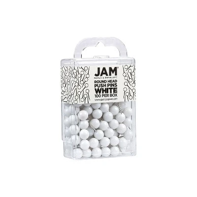 Push aside that tape and those staples and choose Push Pins! Your board needs some color. The best way to do this is with something that will not only make your papers stay on, but also brighten up the office space. Keep organized in the most creative and fun way possible. Sold in packs of 100, these vibrant, pristine thumbtacks are essential to anything worth posting. Colored decorative push pins make for a great way to add some style to the board and additional color to whatever you may be pinning. Choose orange for Halloween bulletins, or Baby Blue and Baby Pink for Baby Shower flyers, even Red and Green for Christmas party flyers. JAM Push Pins are available in Blue, Baby Blue, Green, Lime Green, Yellow, Fuchsia, Light Purple, Purple, Red, Black, Chocolate Brown, Orange, Baby Pink, Teal, Silver, Gold, Rose Gold, and White. We even have clear push pins! Round-top Push Pins are available in Silver Gold. Plastic Head Thumb Tacks | Color: White. Size: Standard (approx. 1 inch) | Steel tipped – perfect for pinning maps and calendars. Quantity: 100 Push Pins | Durable and reusable thumbtacks designed for a long lasting, strong hold. Used to pin important papers or pictures to Bulletin Boards, Cork Boards, Calendars, and Walls. Keep your school work, office work, art and visual projects organized with colored push pins!. Thumb tacks. Sold as 1 Each.