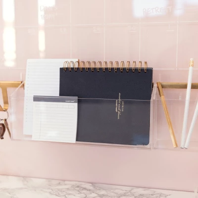 Keep all of your important documents, note taking pads or outgoing mail organized with our acrylic wall valet. Add on to our acrylic wall calendars, memo board or rail to create your custom wall system. Perfect size to accommodate your personal papers in your entryway for easy access. Features our classic gold tone hardware, fits standard size envelopes and letter size paper. Due to the unique nature of our brass accents it may come with a more weathered, vintage look. If the desire is for a shinier finish we suggest using brass polish to enhance the look.