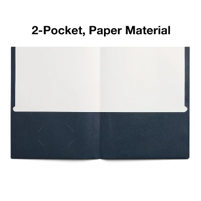 Supply your meeting or classroom with this 25-pack of Staples navy school-grade two pocket folders. Keep papers and handouts organized with these Staples school-grade two-pocket folders. Each folder in this 25-pack opens to pockets on each side, and the navy color offers a professional look for the office or classroom. An inner cutout makes adding a business card simple. These Staples school-grade two-pocket folders are made from economy weight paper and accommodate 25 sheets per pocket. School folder is made from navy cardstock so they are durable yet still lightweight. Two pockets provide storage space for papers, brochures, and more. Comfortably holds standard letter size paper. 25 per box provides enough for almost any project. 50-sheet capacity allows for convenient organization of loose papers. Sold as 25/Box.