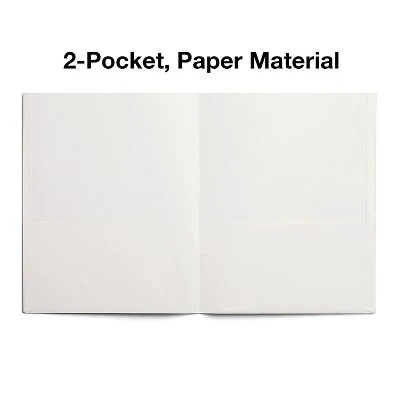 Protect important papers with this 25-count box of Staples school-grade two pocket folders. Use these white folders to keep paperwork organized. Each folder holds 25 pages per pocket and features an inner cutout perfectly sized for displaying a business card. This 25-count box ensures there’s plenty to go round. Made of white economy-weight paper, these Staples two-pocket folders look crisp and professional, and the letter size dimensions ensure they’re compatible with most standard-sized documents for easy filing. School folder is made from white cardstock so they are durable yet still lightweight. Two pockets provide storage space for papers, brochures, and more. Comfortably holds standard letter size paper. 25 per box provides enough for almost any project. A business card holder adds an extra professional touch to each folder. Sold as 25/Box.