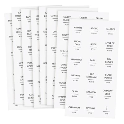 - Round Spice Jar Labels Preprinted, 144 Most Common Spice Names, Minimalist Style: 127 seasoning labels with the spices found in every kitchen. From spice pie, basil, and cinnamon, to spearmint, vanilla sticks, and tacos, a comprehensive reference sheet with an alphabetized list of labels is included with this set; 7 blank labels and 10 numbers are also included