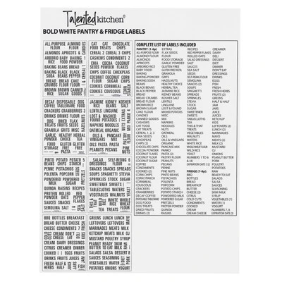 - Labels for Kitchen Organization: Create a picture-perfect kitchen with this set of 224 preprinted jar labels for pantry organization; the stickers include 216 commonly used ingredients, such as Baking Powder, Baking Soda, Corn Starch, Beans, Bread Flour, Cake Flour, Chocolate Chips, Cocoa Powder, Coffee, Nuts, Popcorn, Powder Sugar, Tea, All Purpose Flour, Bread Crumbs, Brown Rice, Chips, Cookie, Corn Meal, Pancake Mix, Pasta, Rolled Oats, White Rice, White Sugar, and Whole Wheat Flour