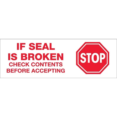3″”(W) x 110 yds.(L) pre-printed carton sealing tape with legend “”Stop If Seal Is Broken”” Includes 1 per pack. Tape Logic™ Pre printed “”Stop If Seal Is Broken”” carton sealing tape in red/white color measures 3″” and has strong adhesive. Pressure sensitive tape communicates handling instructions and seals at the same time, sold as 24 per case. 24/Case. Thickness: 2.2 mil. Length: 110 yds. Thickness: 2 mil. Legend: “”Stop If Seal Is Broken””. Pressure sensitive. Eliminates the need for labels. Tape communicates handling instructions and seals at the same time. Freight class: 50. Width: 3″”. Length: 110 yds. 24 Rolls. Sold as 24 Per Case.