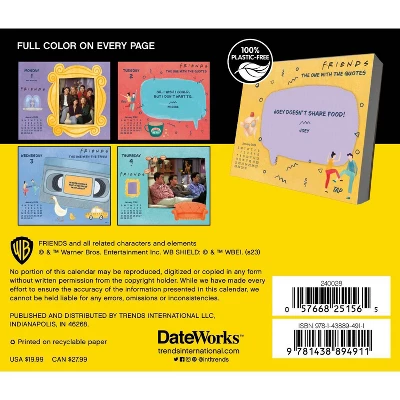 This 2024 Friends Calendar will be there for you whenever you’re feeling frazzled by the day’s events. Have a cup of coffee, relax, and maybe even watch a little Friends as you read through the hilarious quotes and trivia questions from the hit TV show that make up this 2024 calendar. Day-at-a-Time Calendars feature full-color, page-a-day designs with Saturday and Sunday combined, and a sturdy, self-standing easel making it the perfect addition to your office desk decor. To help reduce waste, DateWorks Day-at-a-Time Calendars are now plastic-free! The former plastic easel is now a sturdy, eco-friendly gray board material. DateWorks 2024 Calendars are great for staying organized and productive all year long. They also make a perfect gift for anyone on your list!