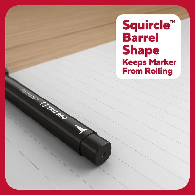 Create detailed, indelible labels with this 12-pack of TRU RED ultra fine black permanent markers. Write resilient markings and messages with these black permanent markers. An ultra fine tip distributes permanent black ink evenly across multiple surfaces. Up to 500 meters of life per marker ensure large workloads can easily be handled. Each marker in this 12-pack of TRU RED ultra fine black permanent markers comes equipped with a cap and clip for minimal mess and maximal portability. Marks most surfaces easily and resists fading. Bold black color makes your signs or notes easy to read at a distance. Ultra fine precision tip for smooth, clean writing. Low odor formula ideal for classrooms, office, or home. Designed with visual cues to let you see ink color and tip type of your permanent marker at a glance. Squircle barrel shape not only provides a comfortable grip, but also keeps the marker from rolling off your desk. Water Resistant Ink. Dozen per pack. AP certified non-toxic. Sold as 1 Dozen.